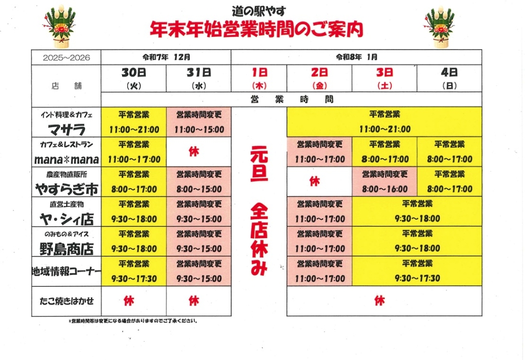 道の駅やすは、元旦は全店舗をお休みさせて頂きます。